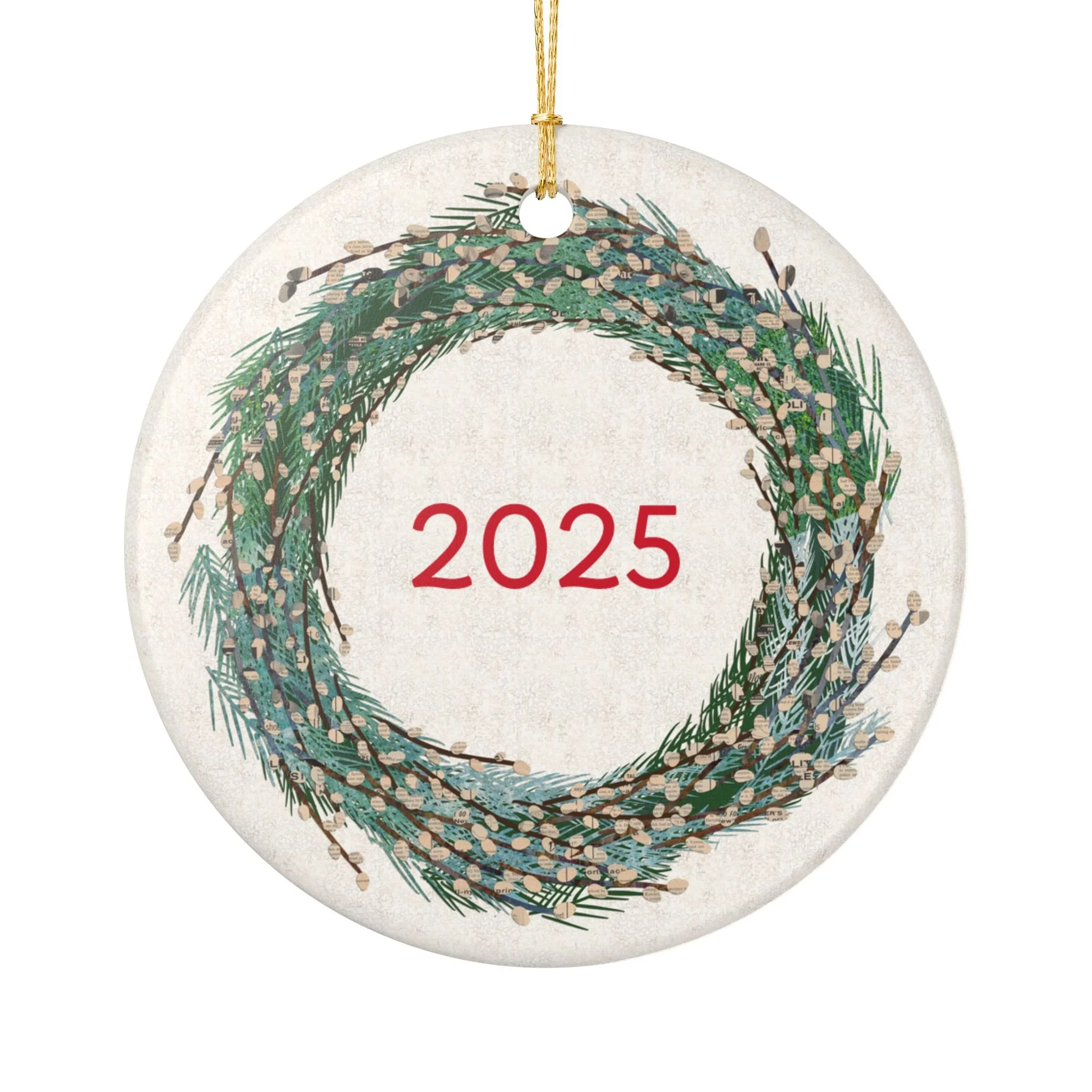 Holiday Wreath Pussy Willows Collage Ornament brings a festive and cheerful vibe to any holiday decor. Perfect for hanging on a Christmas tree or using as a decorative accent. Ideal for individuals who love holiday decorations and those looking to add a unique touch to their festivities. Relevant for Christmas, Hanukkah, New Year's, and winter celebrations.