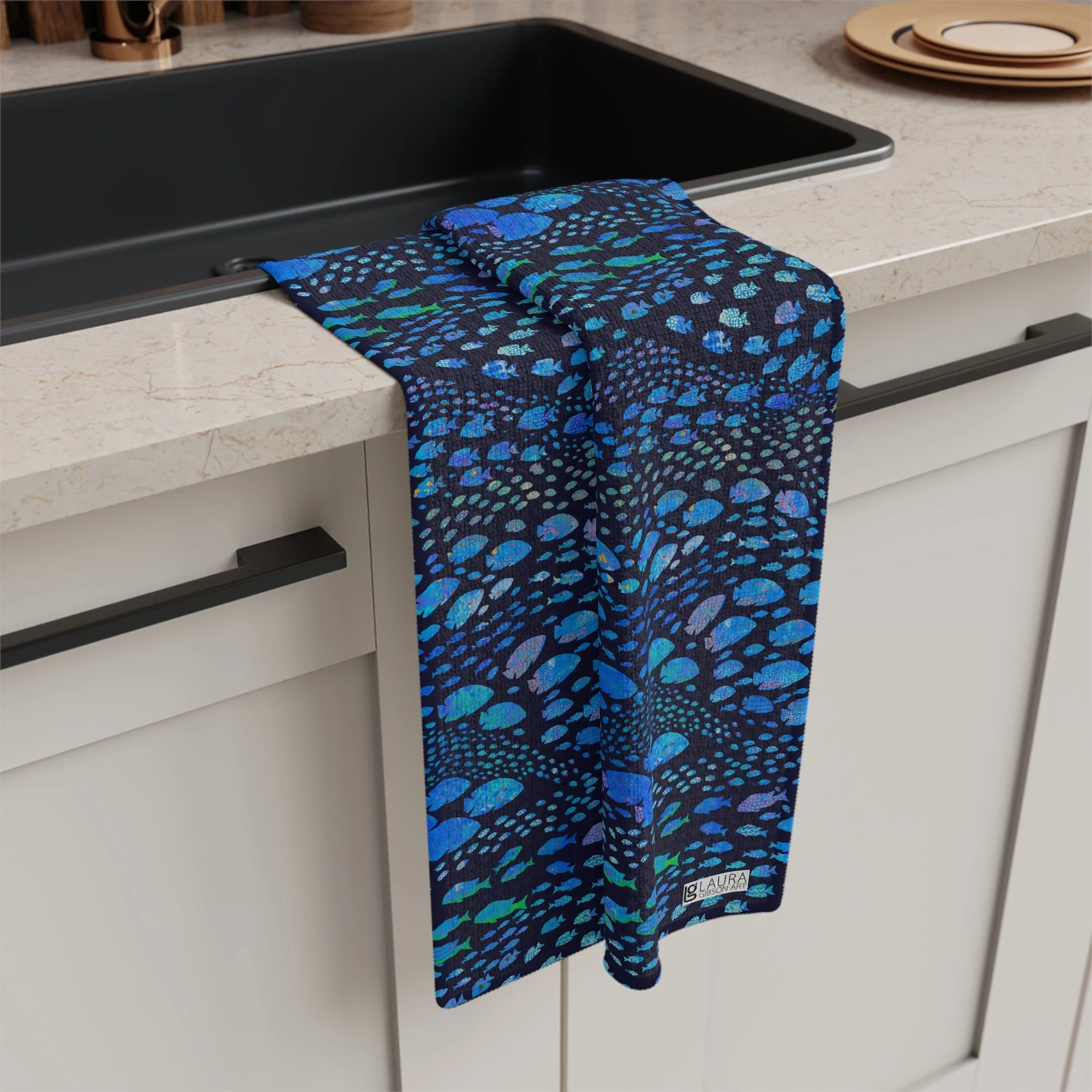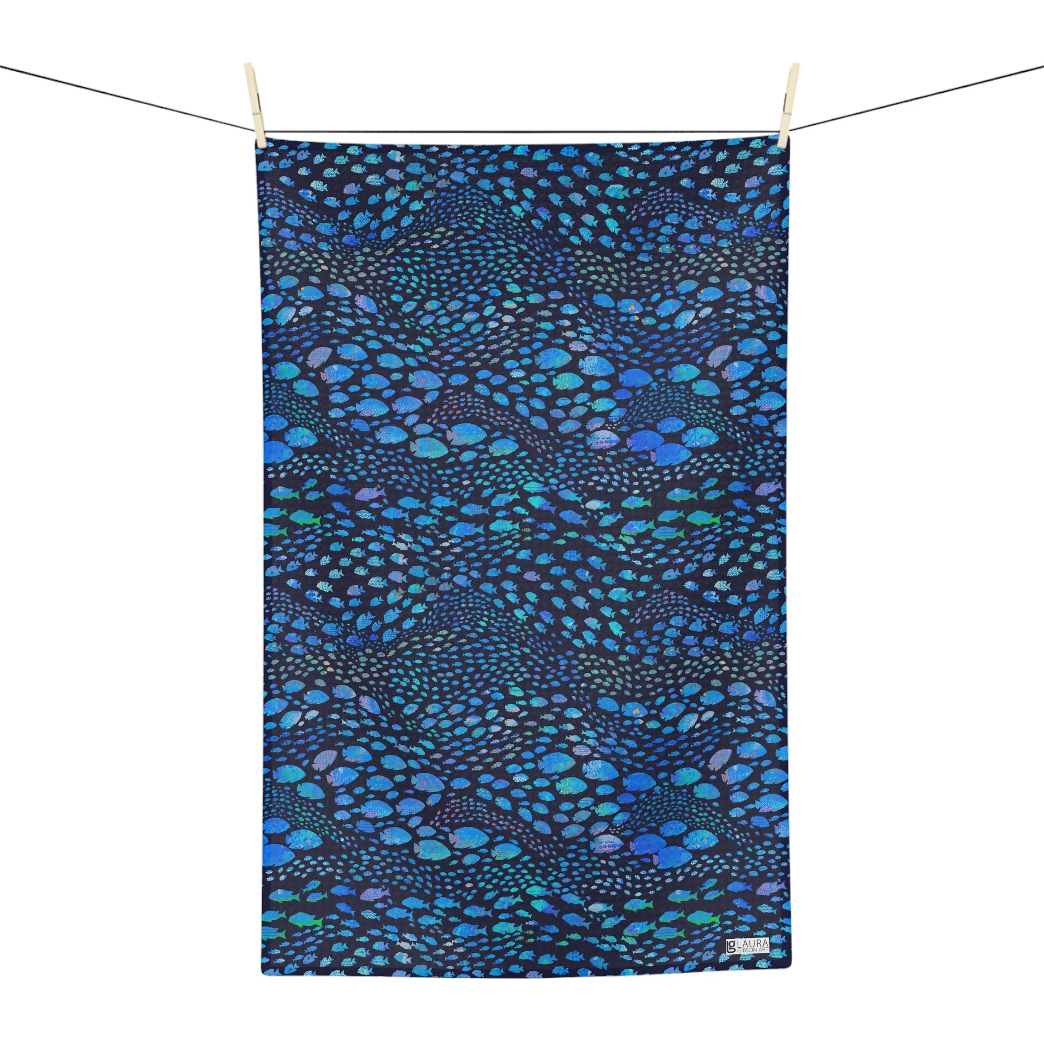 Microfiber Tea Towel in Tropical School of Fish - Dark Blue